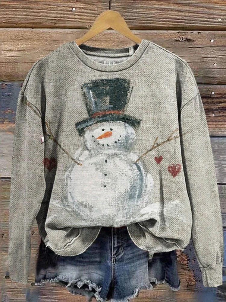 Women's Vintage Snowman Art Print Casual Crew Neck Sweatshirt